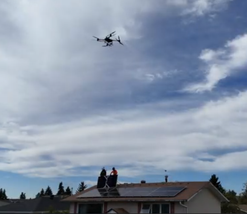 We equip our specialized drones with the Solar Grabber, a patented lifting mechanism designed to securely hold and transport solar panels without damage